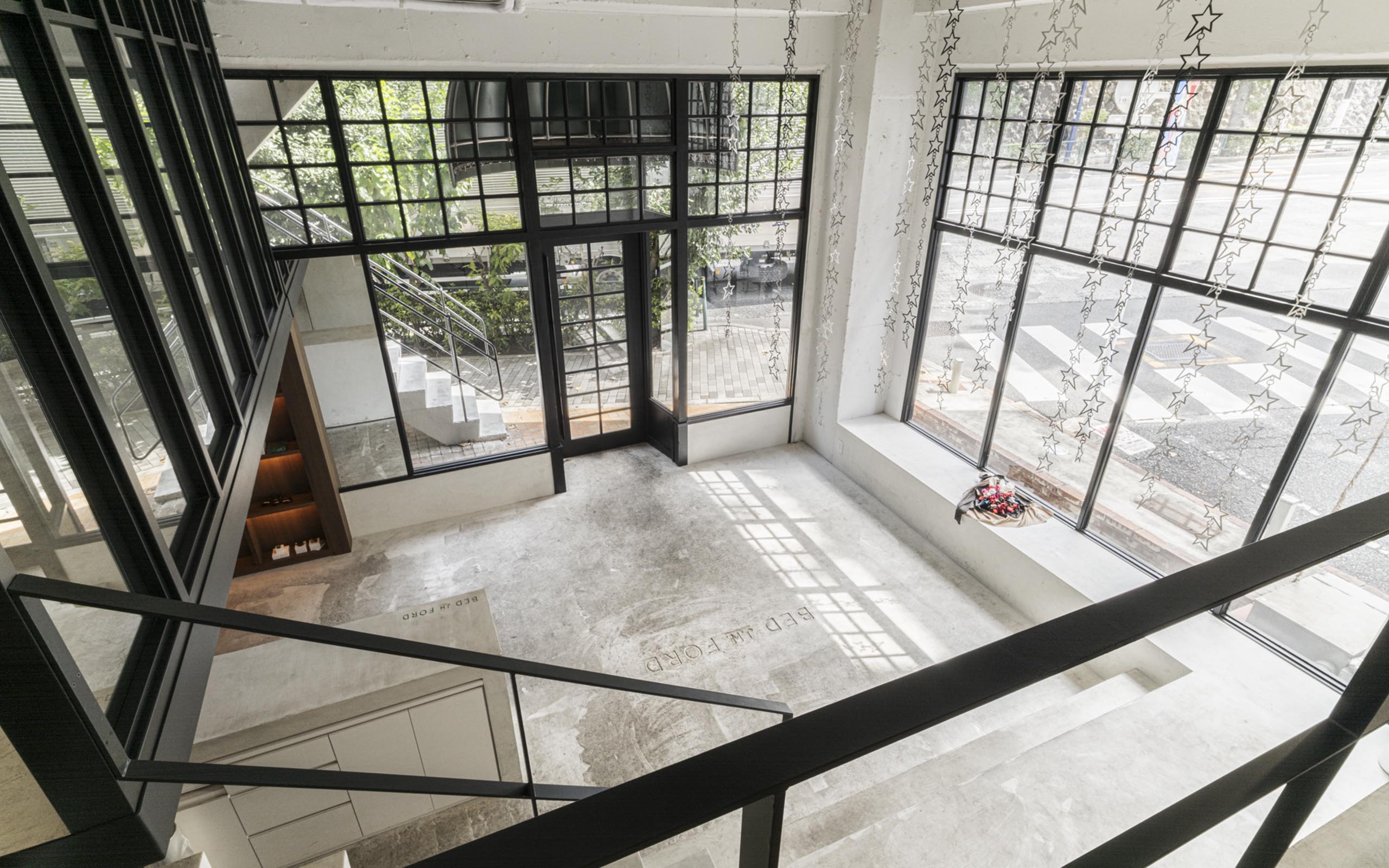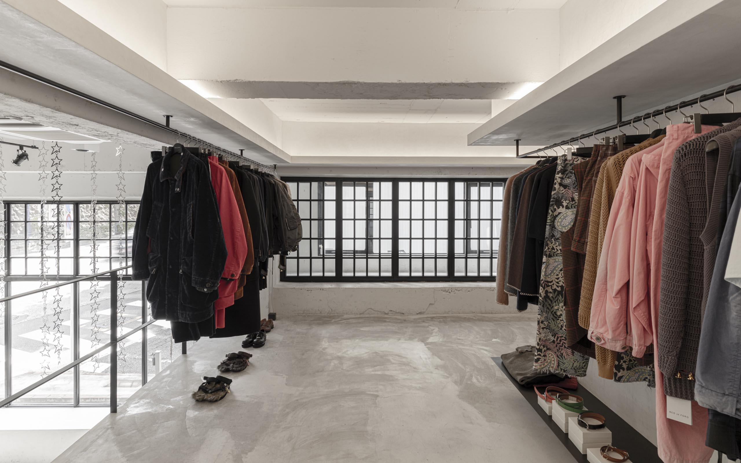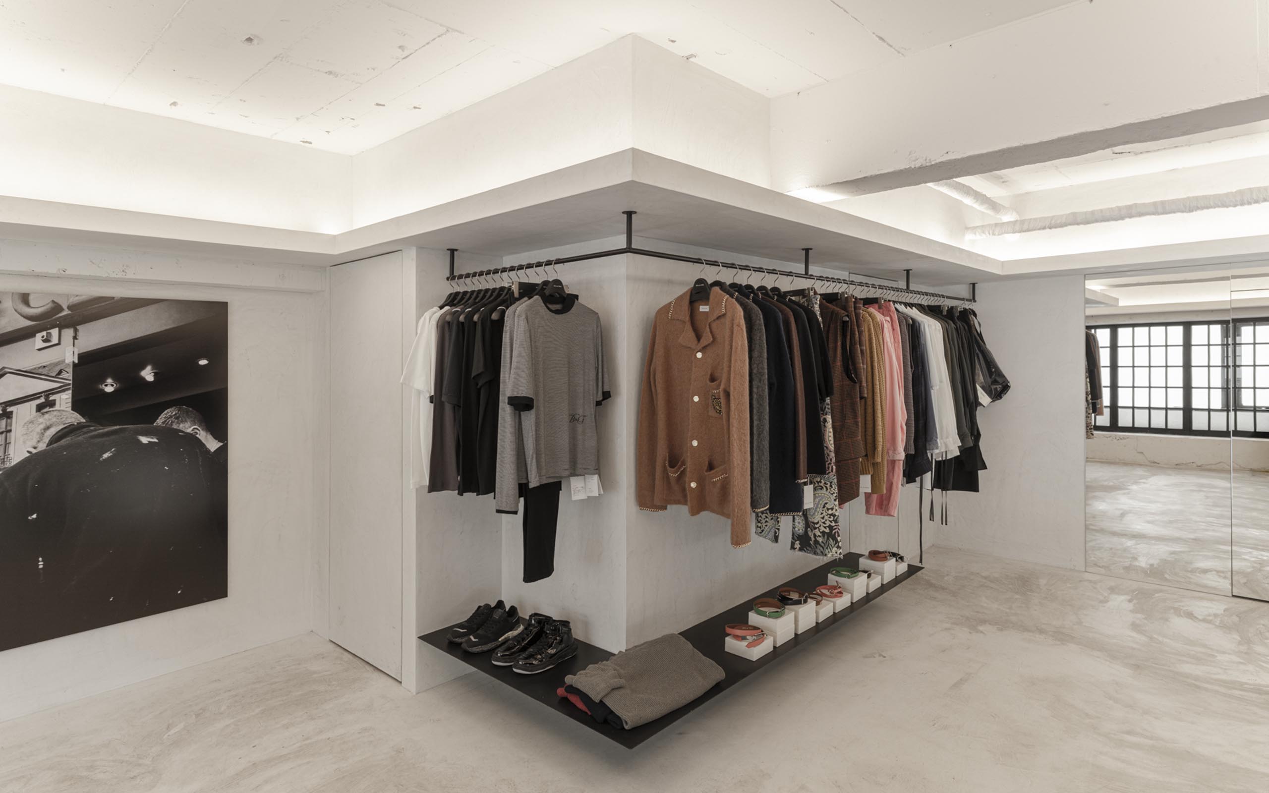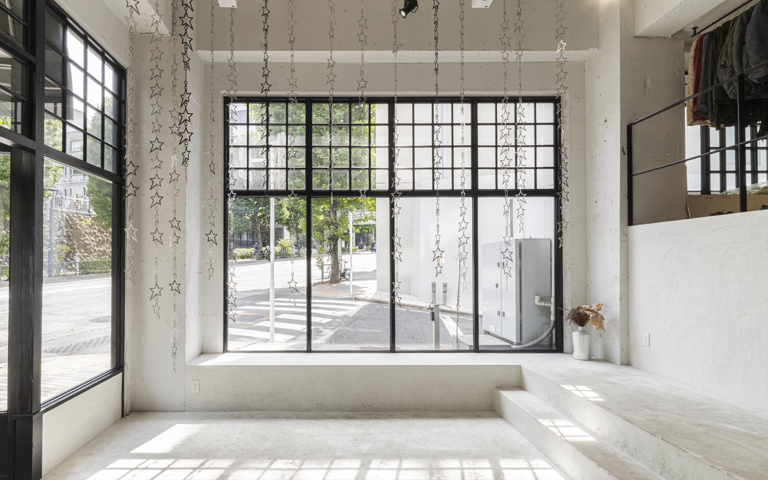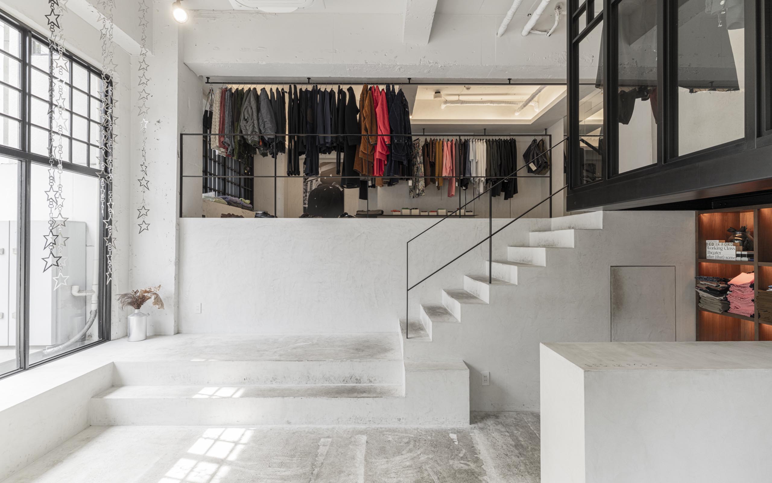 ホワイトとグレーを基調とした無機質な空間 ブランドアイコンであるスターシンボルが、 ハンガーラックとなり星降る夜のごとく美しく店内に降り注ぐ。